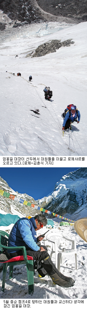 원정대원들은 장비.수송.식량.행정.기록의 역할을 분담했다. 엄 대장은 어떤 대원보다 변화에 정통했다. 매일 변화를 점검하며 고민하던 그는 캠프 3와 캠프 4에 비축됐어야 할 식량.부탄가스가 부족하다고 판단, 1차 등정 시도를 중단했다. 그리고 다음날 아침, 셰르파를 동원해 부족한 물자를 수송했다. 일부 대원은 "시간이 없으니 (식량과 가스가) 약간 부족하더라도 등반을 계속하자"고 걱정을 섞어 건의했다. 그러자 "그런 식으로는 안 된다"는 엄 대장의 질책과 호통이 떨어졌다.